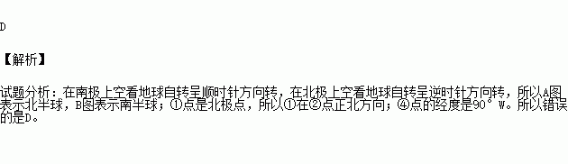C.①点在②点正北方向 D.④点的经度是90°E