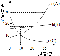 (5)20℃时,取100 g A物质的饱和溶液,将温度升高到35℃时,因A的溶解度随温度的升高而升高,所以溶液会由饱和溶液变为不饱和溶液,但溶液中溶质的质量分数保持不变.