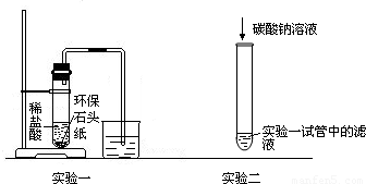 (1)实验一:试管中产生大量的气泡,烧杯中澄清的石灰水变浑浊,请写出“环保石头纸”与稀盐酸发生反应的化学方程式 (假设“环保石头纸”中的其他成分既不溶于水,又不与盐酸发生反应);