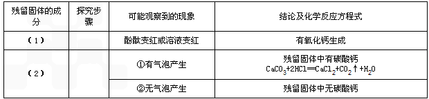 | (2)还可能有碳酸钙 | 另取残留固体滴加足量盐酸 | 现象:固体溶解并有气泡产生 | 结论: 有碳酸钙 |