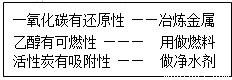A、一氧化碳具有还原性,常用于冶炼金属;乙醇具有可燃性,常用作燃料;活性炭有吸附性,能吸附色素和异味,能做净水剂,所以正确;