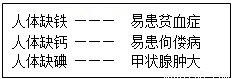 C、人体缺铁易得贫血症;少年儿童缺钙易患佝偻病;碘是合成甲状腺激素的主要元素,缺乏会患甲状腺肿大,故正确;