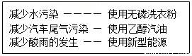 D、使用无磷洗衣粉可以减少水体污染;乙醇汽油是相对清洁的燃料,能减少尾气的污染;使用新型能源,可以减少二氧化硫等有害气体的排放,减少酸雨的产生,所以正确.