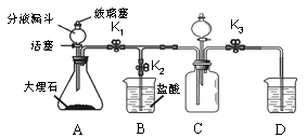 解析试题分析:(1)收集一瓶二氧化碳:打开止水夹K1和K3,关闭K2,从分液漏斗向装置A中加入足量的稀盐酸,A中发生反应的化学方程式为CaCO3 + 2HCl CaCl2 + H2O + CO2↑;当看到D中有大量浑浊产生时,CO2已集满, D中发生反应的化学方程式为CO2+ Ca(OH)2 CaCO3↓+H2O;