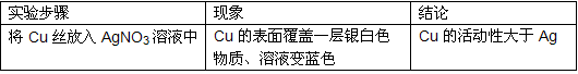 铜的表面有银白色固体析出; 铜比银活泼 铜的表面有银白色固体析出; 铜比银活泼 |