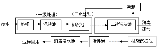 (6分)下列图示是城市污水处理流程图:![]()
