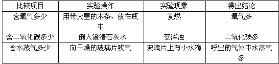 | ①取两块干燥的玻璃片,对着其中的一块呼气. | 对着呼气的一块玻璃片上有水滴生成 | 人呼出的气体中,含有的水蒸气比空气中含有的水蒸气 多 多 |