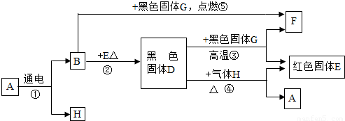 【答案】分析:此题为框图式物质推断题,完成此类题目,关键是找准解题突破口,根据叙述的关键,以及物质的性质和物质之间的反应,做出判断,A通电能生成B和H,则A为水,B和H为氢气或氧气,黑色固体G能在B在这燃烧,则B为氧气,H为氢气,G可能为碳,F可能为二氧化碳,E为红色固体,则E为铜,与氧气反应生成的黑色固体D为氧化铜,代入框图,推断合理.