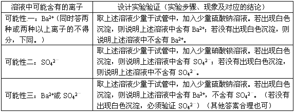 可能性一:Ba2+ 可能性二:SO42- 可能性三:Ba2+或SO42- 可能性一:Ba2+ 可能性二:SO42- 可能性三:Ba2+或SO42- | ①取上述溶液少量于试管中,加入少量硫酸钠溶液.若出现白色沉淀,则说明上述溶液中含有Ba2+;若没有出现白色沉淀,则说明上述溶液中不含有Ba2+., ②取上述溶液少量于试管中,加入少量硝酸钡溶液.若出现白色沉淀,则说明上述溶液中含有SO42-;若没有出现白色沉淀,则说明上述溶液中不含有SO42-. ③取上述溶液少量于试管中,加入少量硫酸钠溶液.若出现白色沉淀,则说明上述溶液中含有Ba2+,不含有SO42-. ①取上述溶液少量于试管中,加入少量硫酸钠溶液.若出现白色沉淀,则说明上述溶液中含有Ba2+;若没有出现白色沉淀,则说明上述溶液中不含有Ba2+., ②取上述溶液少量于试管中,加入少量硝酸钡溶液.若出现白色沉淀,则说明上述溶液中含有SO42-;若没有出现白色沉淀,则说明上述溶液中不含有SO42-. ③取上述溶液少量于试管中,加入少量硫酸钠溶液.若出现白色沉淀,则说明上述溶液中含有Ba2+,不含有SO42-. |