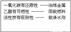 解答:解:A、一氧化碳有还原性,所以可用于冶炼金属;乙醇有可燃性,所以可作燃料;活性炭有吸附性,所以可用来吸附色素和异味,作为净水剂,全部正确;