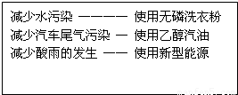 D、防止水污染可使用无磷洗衣粉,可防止水体富营养化;乙醇燃烧生成二氧化碳和水,汽油燃烧排放的尾气中含有一氧化碳、氮的氧化物、含铅化合物等有毒物质,故使用乙醇汽油可减少尾气污染;减少酸雨的发生,可使用新型能源,正确;