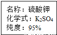 | 名 称:硫酸钾 化学式:K2SO4 纯 度:95%(1)硫酸钾的相对分子质量为 (2)该钾肥中钾元素的质量分数为 查看答案和解析>> 科目:初中化学 来源: 题型: 小莹同学的父亲买回一袋肥料,其包装袋上的部分文字内容如图所示.为确定该化肥纯度(即K2SO4的质量分数)是否符合标准.小莹同学称取10克样品,加入适量水溶解后,与足量的氯化钡溶液充分反应.过滤、洗涤、烘干沉淀,测得其质量为11.65克.回答下列问题:(K2SO4+BaCl2═BaSO4↓+2KCl) (1)该化肥属于 钾 钾 肥(2)运用实验数据帮小莹同学计算一下该化肥的纯度.(写出计算过程) (3)通过计算,你发现了什么? 查看答案和解析>> 科目:初中化学 来源: 题型: 试求: (1)硫酸钾中钾、硫、氧三种元素的质量比为 39:16:32 39:16:32 ;(2)50Kg这种硫酸钾样品肥中含有钾元素的质量为 21.3Kg 21.3Kg .查看答案和解析>> 科目:初中化学 来源: 题型:解答题 小莹同学的父亲买回一袋肥料,其包装袋上的部分文字内容如图所示.为确定该化肥纯度(即K2SO4的质量分数)是否符合标准.小莹同学称取10克样品,加入适量水溶解后,与足量的氯化钡溶液充分反应.过滤、洗涤、烘干沉淀,测得其质量为11.65克.回答下列问题:(K2SO4+BaCl2═BaSO4↓+2KCl) |