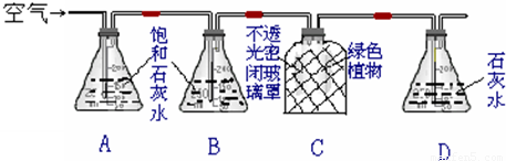 | ①将各装置按如图所示连接好并装入化学试剂,C中放入绿色植物 | ①A装置的作用是______ ②B装置的作用是______ ③C处玻璃罩不能透光的原因是______ |
