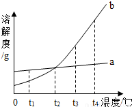 (1)t4℃时,a、b溶解度的大小关系是:a (12) b。