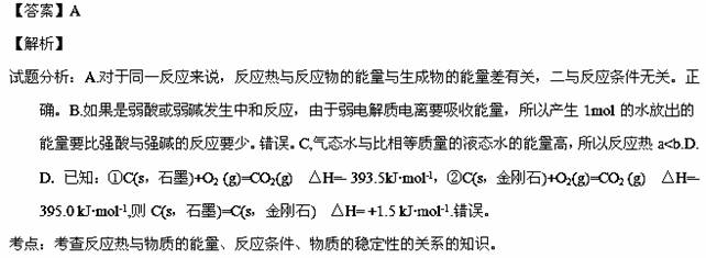 D.已知:①C(s,石墨)+O2 (g)=CO2(g) △H=- 393.5kJ·mol-1,②C(s,金刚石)+O2(g)=CO2 (g) △H=- 395.0 kJ·mol-1,则C(s,石墨)=C(s,金刚石) △H= -1.5 kJ·mol-1
