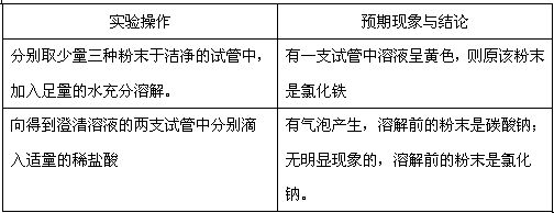 | 有三种白色粉末,分别是碳酸钠、氯化铁和氯化钠中的一种。请设计一个实验方案,把这三种粉末区分开来。叙述实验操作、预期现象和结论。 | ||||||