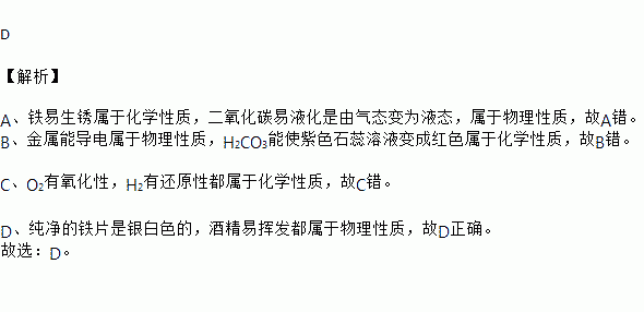 C.O2有氧化性,H2有可燃性 D.纯净的铁片是银白色的,酒精易挥发