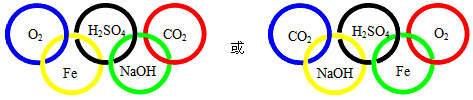 (1)选择氧气、铁、二氧化碳、氧化钙、稀硫酸、烧碱溶液、氯化钡溶液、碳酸钙中的五种物质(所选物质至少包括“单质、氧化物、酸、碱、盐”中的四种类型),将其化学式分别填入对应的环内。