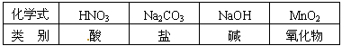 在下表“类别”栏目内,选填“氧化物”、“酸”、“碱”或“盐”。