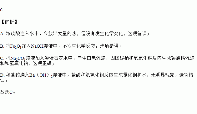 A.浓硫酸注入水中 B.将Fe2O3加入NaOH溶液中