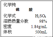 解答:解:(1)标签中给出该瓶浓硫酸的体积500mL、密度1.84g/mL和溶液的溶质质量分数98%,