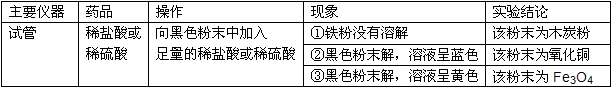 有气泡产生,黑色粉末全部溶解,有红色固体生成并得到澄清、透明溶液 | 该固体的成分是: 铁和氧化铜 铁和氧化铜 |