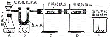 | 具有良好的气密性,是做好实验的基础; 书写化学方程式要注意规范性; 通过实验比较可以判断铁生锈的条件、速率; 钢铁与水和氧气同时接触时容易生锈. | |