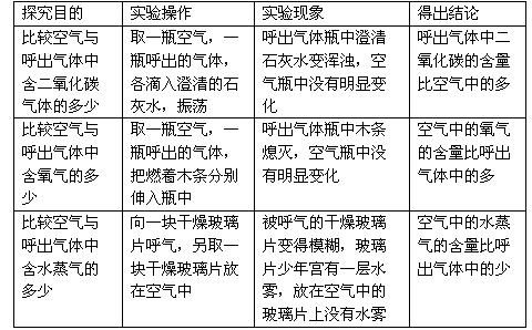 请根据在“我们吸入的空气和呼出的气体有什么不同”的活动与探究内容,填写下表