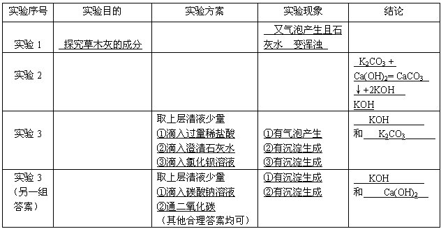 实验1 | 探究草木灰的成分 探究草木灰的成分 | ①有气泡产生; ②石灰水变浑浊 ①有气泡产生; ②石灰水变浑浊 | 草木灰的主要成分是碳酸钾 | |