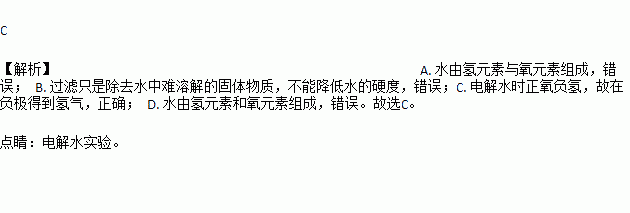 A. 水分子由氢元素与氧元素组成 B. 过滤可以降低水的硬度