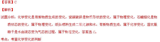 A.瓷碗破碎 B.石蜡熔化 C.纸张燃烧 D.湿衣晾干