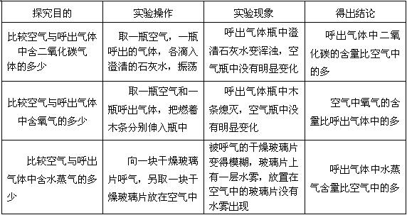 | 请根据在“我们吸入的空气和呼出的气体有什么不同”的活动与探究内容,填写下表 | ||||||||||||||||
