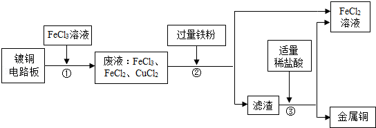 2Fe+3CO2;(4)Ⅰ.镀铜电路板加入氯化铁溶液能得到氯化亚铁和氯化铜,说明铜能与氯化铁反应生成氯化亚铁和氯化铜,故填:2FeCl3+Cu=2FeCl2+CuCl2;Ⅱ.加入过量的铁粉,则铁能将氯化铜中的铜全部置换出来且有剩余,故得到的滤渣中含有铁和铜,故填:Fe和Cu.