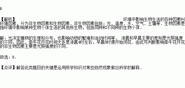 (2015秋•和县期末)牵牛花开花时间大多是在凌晨4时左右,早晨8时便开始闭花.由此可以判断影响牵牛花开花的非生物因素主要是( )