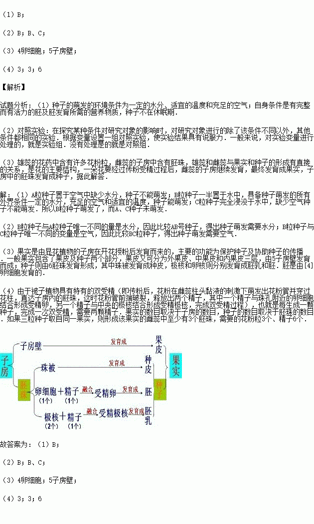 (4)如果这三粒种子取自同一果实,则形成该果实的雌蕊中至少有胚珠 个,需要花粉粒 个,完成双受精作用至少需要精子 个.