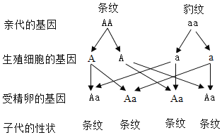 £¨4£©±í¸ñÖÐIII×éÇ×´úÔÓ½»×éºÏÌõÎÆ¡Á±ª°ß£¬ÔÓ½»×Ó´úÖÐÈ«²¿ÎªÌõÎÆ£¬Ôò×Ó´úÖÐÏûʧÁ˵ÄÐÔ×´±ª°ßΪÒþÐÔÐÔ×´£¬ÌõÎÆÎªÏÔÐÔÐÔ×´£¬ÇÒÇ×´úµÄ»ùÒòÐÍΪ´¿ºÏÌåAA¡Áaa£¬×Ó´úµÄÌõÎÆ¶¼ÎªÔÓºÏÌåAa£¬ÒÅ´«Í¼½â£º