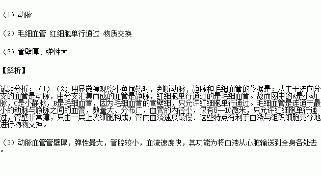 下图是显微镜下观察到的小鱼尾鳍内的一部分血管的分支情况,箭头代表血流方向,请据图分析回答:
