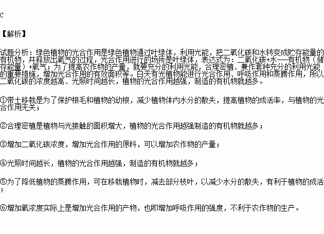 ①移栽根部带土 ②合理密植 ③增加二氧化碳浓度 ④增强光照 ⑤移栽剪去部分叶 ⑥增加氧浓度.