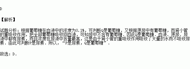 (2015春•济南校级期末)研究被测试者的血浆、肾小管以及输尿管中的液体里面P和Q两种物质的浓度,如表所示,请指出P、Q各是什么物质( )