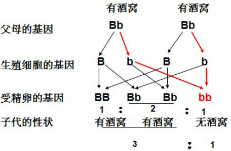 解答:解:由“现在有一对夫妇,均有酒窝,他们的第一个孩子无酒窝”可以推知:该对夫妇的基因组成是杂合的,即都为Bb,他们生育子女的基因组合、性状表现情况如下图: