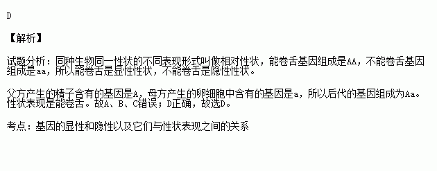 能卷舌的人(基因组成为AA)和不能卷舌的人(基因组成为aa )结婚,后代的基因组成为 ,性状表现是 ( )