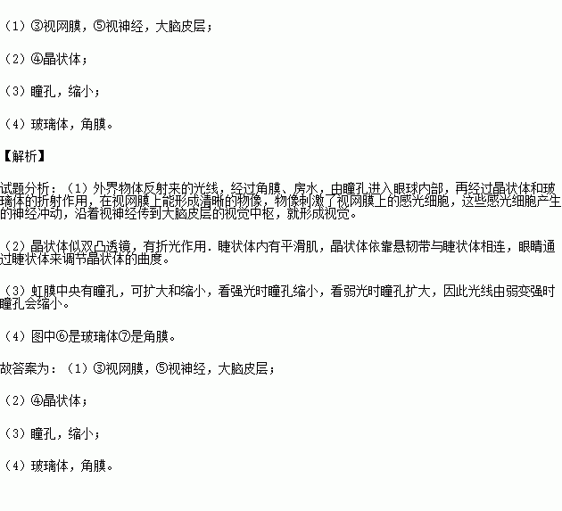 (3)在我们眼睛最前方的一个小孔叫做 ,当光线由弱变强时它会 。