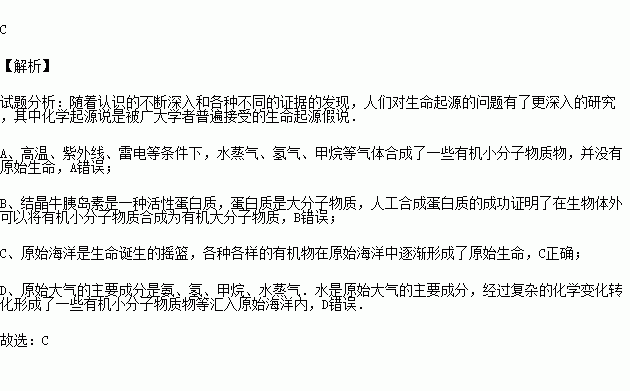D.原始大气中的水蒸气、氨气、甲烷等汇入原始海洋内,逐渐形成了原始生命