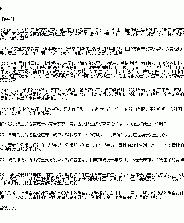 ⑤哺乳动物生殖发育的特点是胎生哺乳.