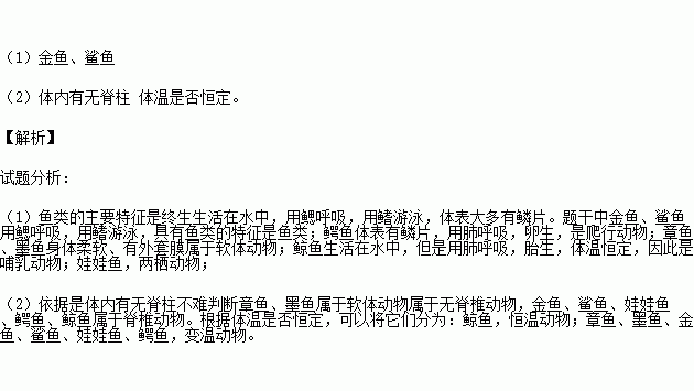 叫“鱼”的动物有很多种,如:章鱼、墨鱼、金鱼、鲨鱼、娃娃鱼、鳄鱼、鲸鱼,等等。但有的“鱼”不一定属于鱼类。回答下列问题。