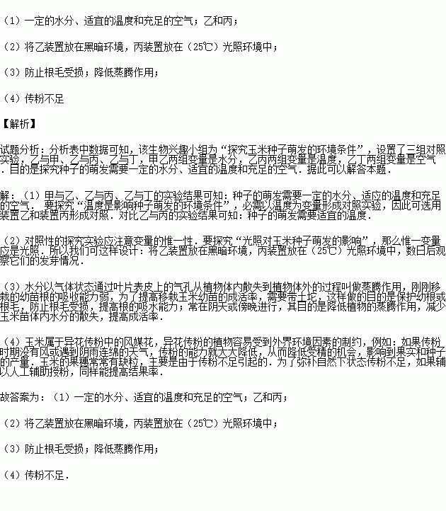 £¨2014•½Î÷Ä£Ä⣩ijÉúÎïÐËȤС×éµÄͬѧ×öÁË¡°Ì½¾¿ÓñÃ×ÖÖ×ÓÃÈ·¢µÄ»·¾³Ìõ¼þ¡±ÊµÑ飺Ôڼס¢ÒÒ¡¢±û¡¢¶¡ËĸöÉÕ±Öзֱð·ÅµÈÁ¿µÄÃÞ»¨£¬ÔÙ½«ÏàͬÊýÁ¿µÄÓñÃ×ÖÖ×Ó·ÅÔÚÉÏÃæ£¬ÔÚ²»Í¬Ìõ¼þϽøÐÐÅàÑø£¬ÊýÈÕºó¼Ç¼·¢Ñ¿Çé¿öÈçÏ£º