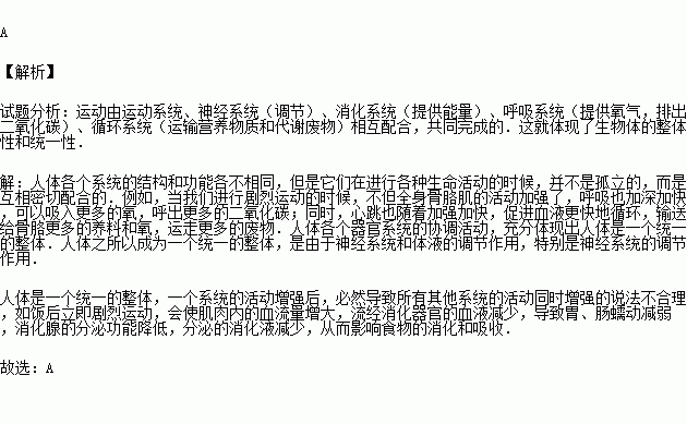 A.人体是一个统一的整体,一个系统的活动增强后,必然导致所有其他系统的活动同时增强