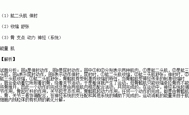 (1)图中骨骼肌①是 ,图B表示 动作。(填“屈肘”或“伸肘”)