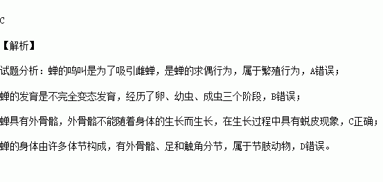 蝉蜕是一味中药,它是蝉发育过程中蜕掉的一层“皮”。下列有关蝉的正确叙述是 ( )