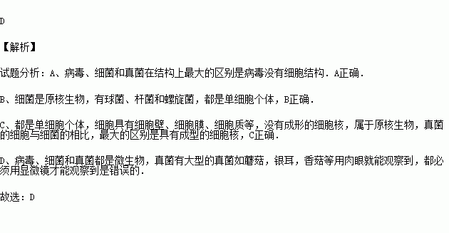 A.病毒、细菌和真菌在结构上最大的区别是病毒没有细胞结构